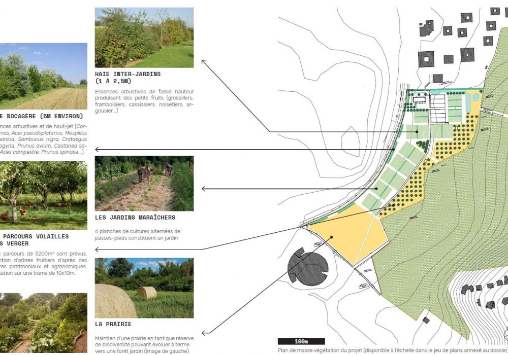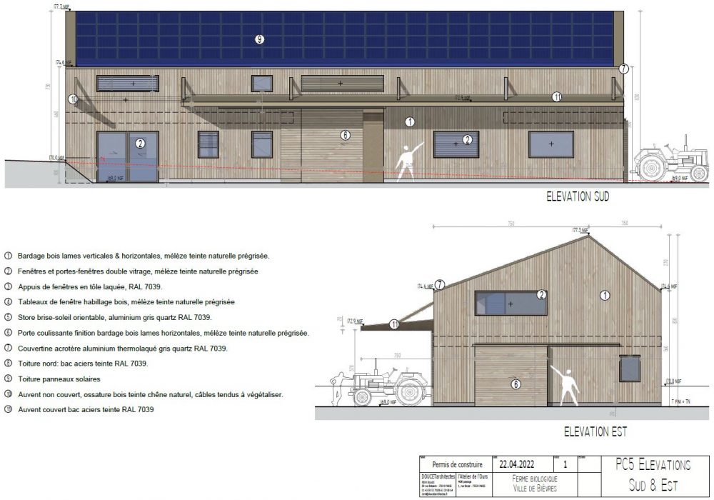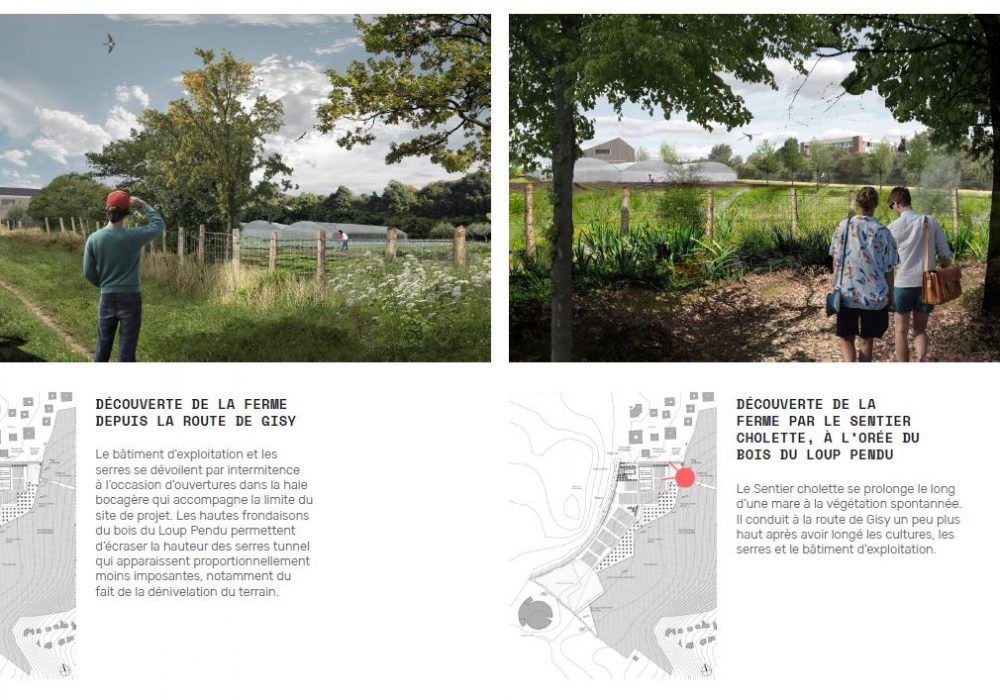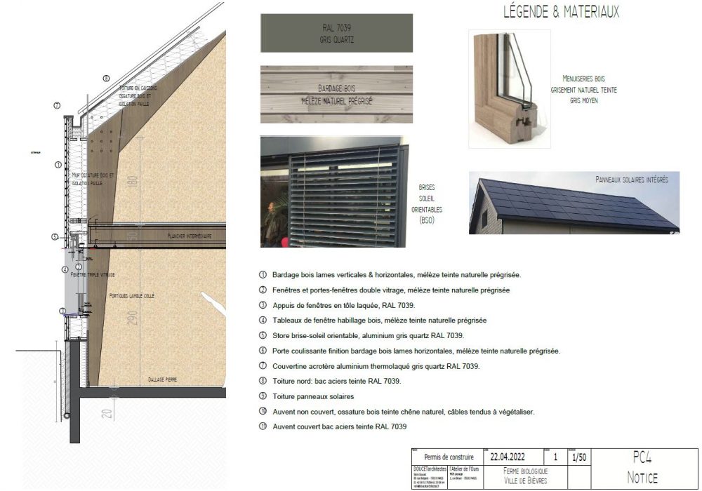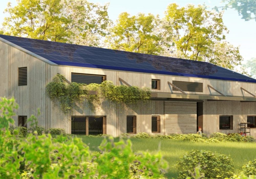 Le projet prévoit un bâtiment en structure et bardage bois et une isolation biosourcée pour une approche “naturelle”, cohérente avec l’activité projetée. Les bottes de paille, dont la production est excédentaire en France, constituent un isolant 100% végétal et biodégradable en circuit court, notamment dans le Sud de l’Essonne et le Plateau de Saclay. Cette isolation permettra de maintenir une température optimale tout au long de l’année dans les locaux de stockage, sans qu’il soit nécessaire de les chauffer ou de les refroidir. Le bâtiment sera équipé de panneaux solaires, d’un système de récupération des eaux de pluies et des eaux usées. Il alimentera notamment le bassin de stockage pour limiter la quantité d’eau prélevée dans la nappe souterraine.