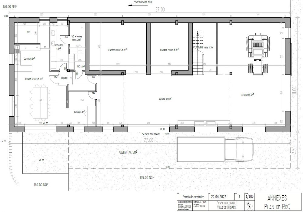 D’une emprise de 300m2, le bâtiment abritera des espaces de lavage, de stockage des productions, du matériel et des machines. La partie administrative comprendra un bureau, des vestiaires et sanitaires, ainsi qu’une salle de vie. Un auvent offrira un zone de transition à l’abri des intempéries, permettant de travailler au sec et de stocker.