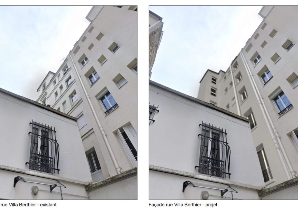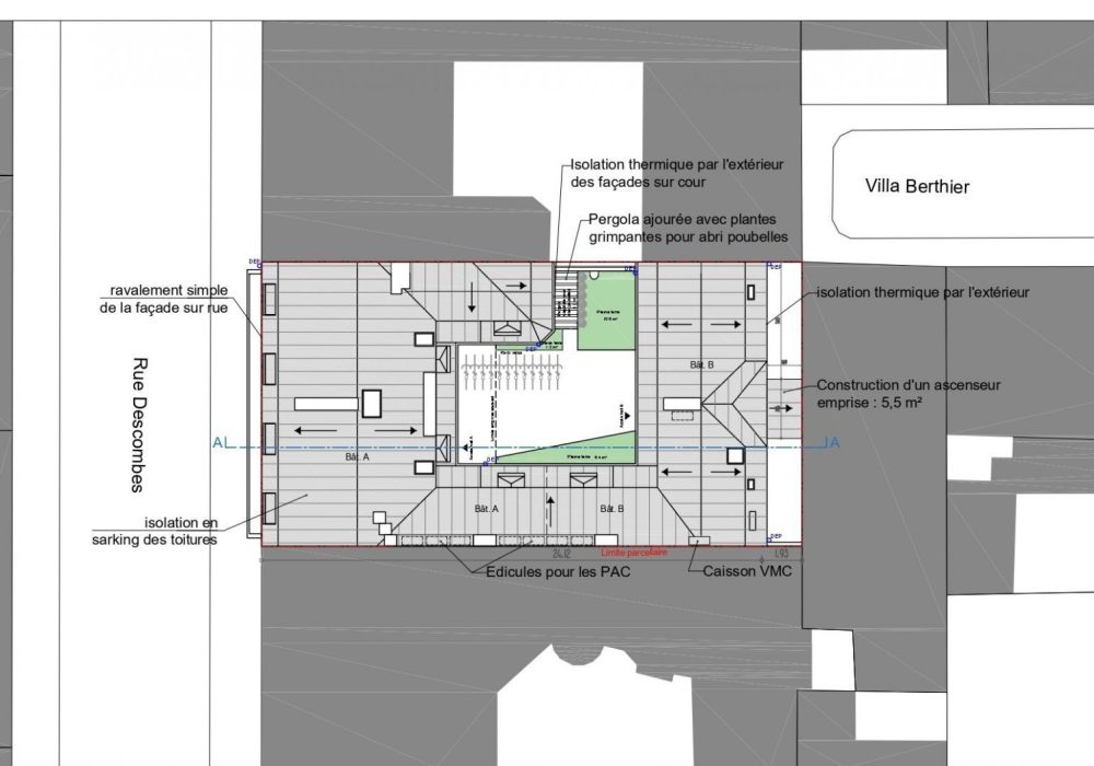 Un ascenseur sera créé dans le bâtiment B afin d’en améliorer l’accessibilité. Il viendra prendre place dans la courette arrière, et la toiture de l’extension créée s’inscrira dans la continuité de la toiture existante.