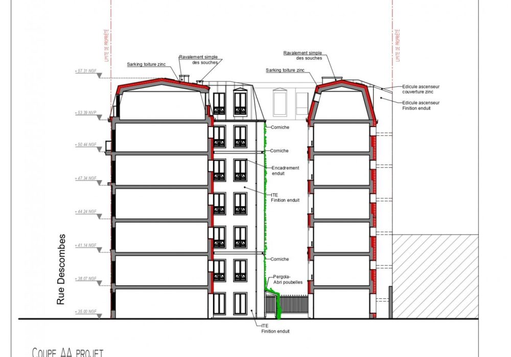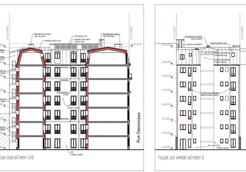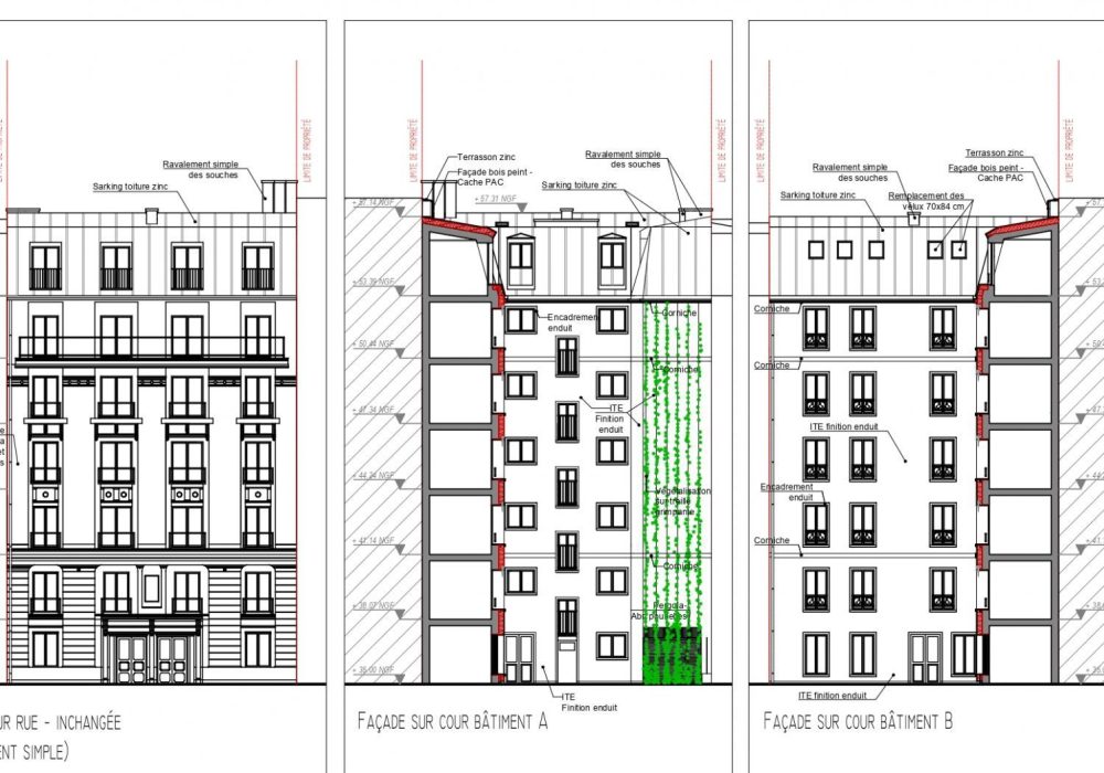 La rénovation thermique effectuée ici concerne l’intégralité des postes mobilisables dans l’immeuble : le ravalement simple de la façade sur rue avec restitution de la pierre de taille, l’isolation par l’extérieur des façades sur cour et courette, la réfection avec isolation de toutes les toitures, la création ou restitution d’un système de ventilation dans les logements, l’isolation du plancher haut des caves, et l’installation de ballons thermodynamiques et de pompes à chaleur.