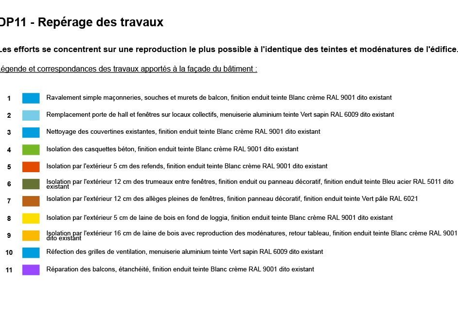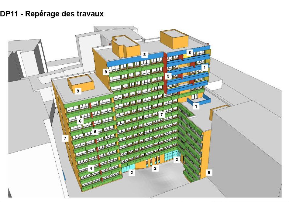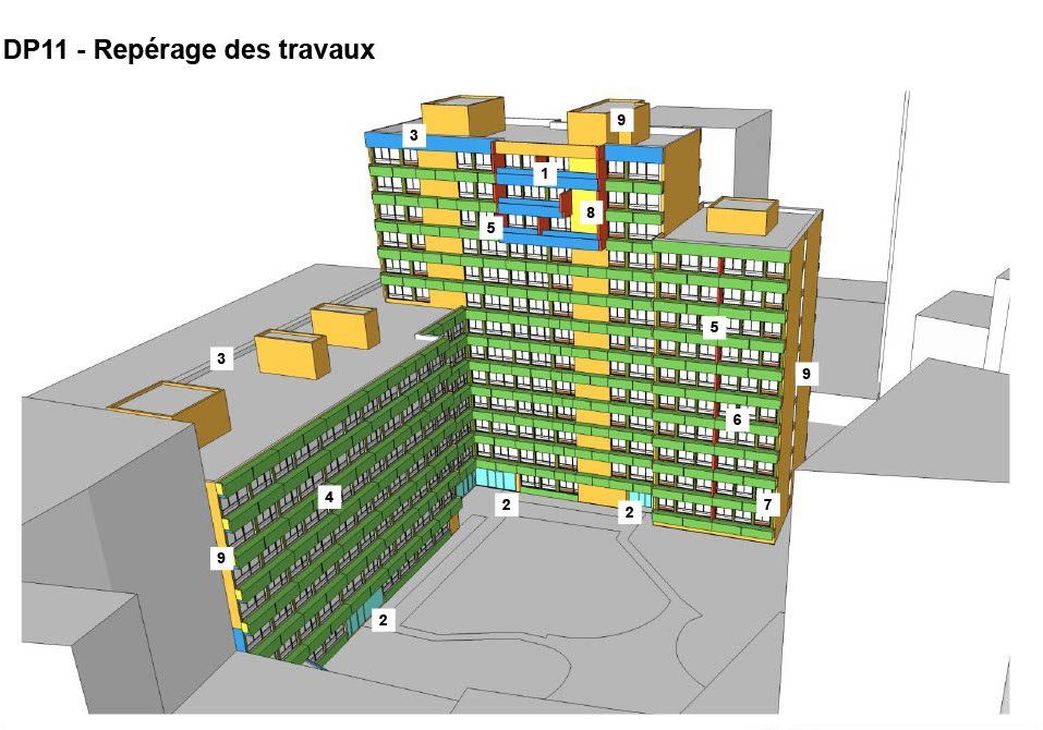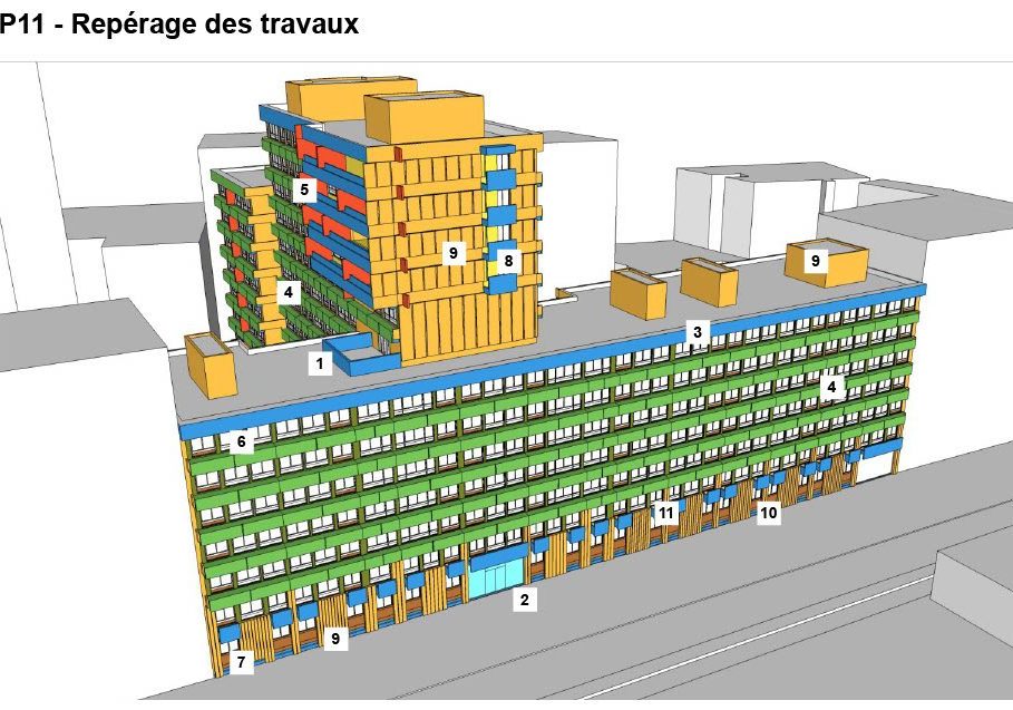 De nombreuses faiblesses sont apparues en phase d’analyse de l’immeuble, et en réponse, la campagne de travaux comporte de nombreuses actions, parmi lesquelles : le remplacement des menuiseries des halls d’entrée et des locaux communs, des portes des édicules en toiture, l’isolation des planchers bas, la mise en place dans les logements d’entrées d’air hygroréglables dans les pièces sèches et de bouches d’extraction hygroréglables dans les pièces humides le ravalement de toutes les façades avec isolation thermique par l’extérieur (ITE), le traitement des ponts thermiques, la réfection des métalleries, et la restitution des modénatures