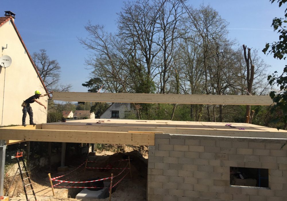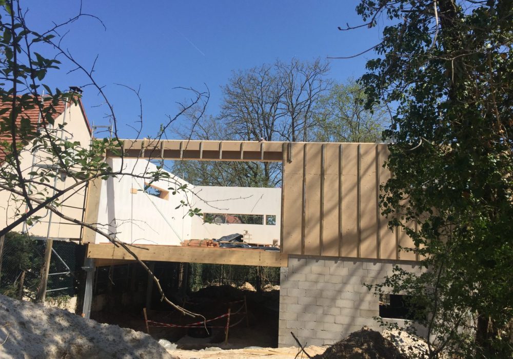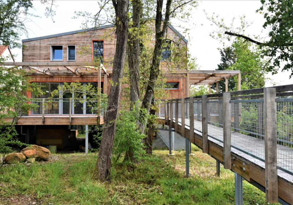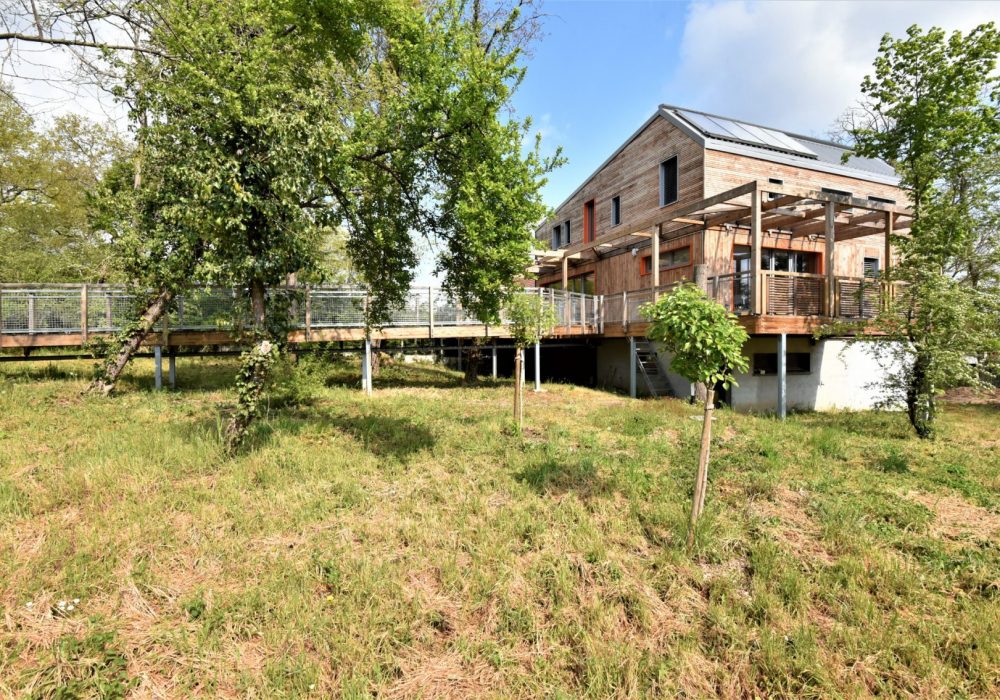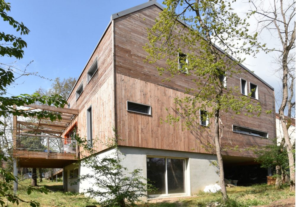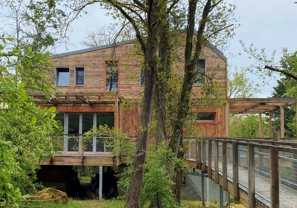 Le bâtiment est posé sur pilotis, pour minimiser les terrassements et l’impact au sol, dans le but de préserver au maximum la faune et la flore existantes, pour sauvegarder les grands arbres adultes présents, et ainsi veiller à la qualité de l’ombre et du feuillage qui viendra protéger ce bâtiment passif de la surchauffe d’été.