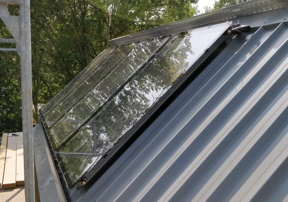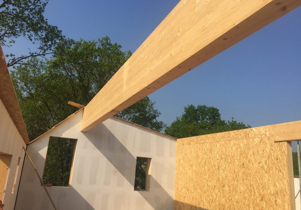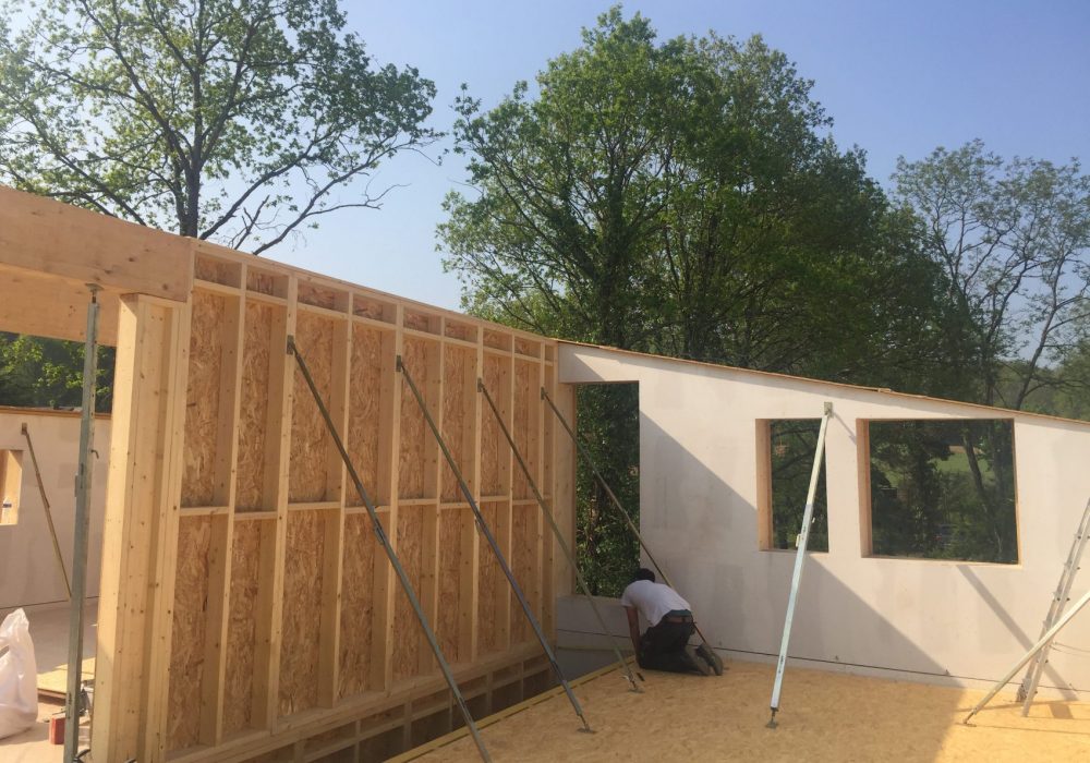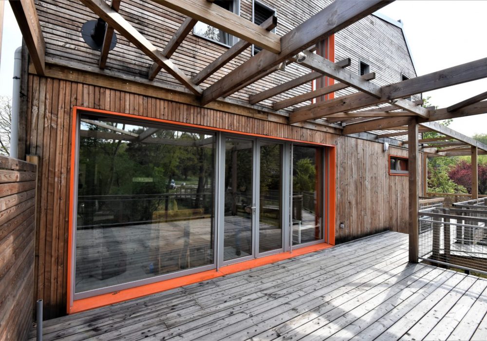 Le niveau bâtiment passif est atteint tout en favorisant les matériaux écologiques, recyclés et locaux. Ainsi, l’enveloppe est constituée d’une ossature en caissons bois préfabriqués et remplis d’isolant paille. Le bardage est en clins de Douglas thermohuilé et posé en « faux claire voie ». Les fenêtres sont en bois-aluminium à triple vitrage de fabrication française. Les occultations sont des Brises Soleils Extérieurs à lames Orientables (BSO) en aluminium. Les équipements techniques, panneaux solaires thermiques, poêle à plaquettes, ventilation à double flux, permettent de compléter l’enveloppe et d’atteindre le niveau passif.