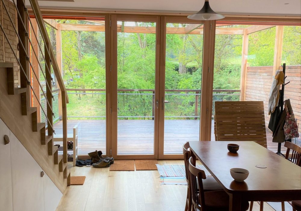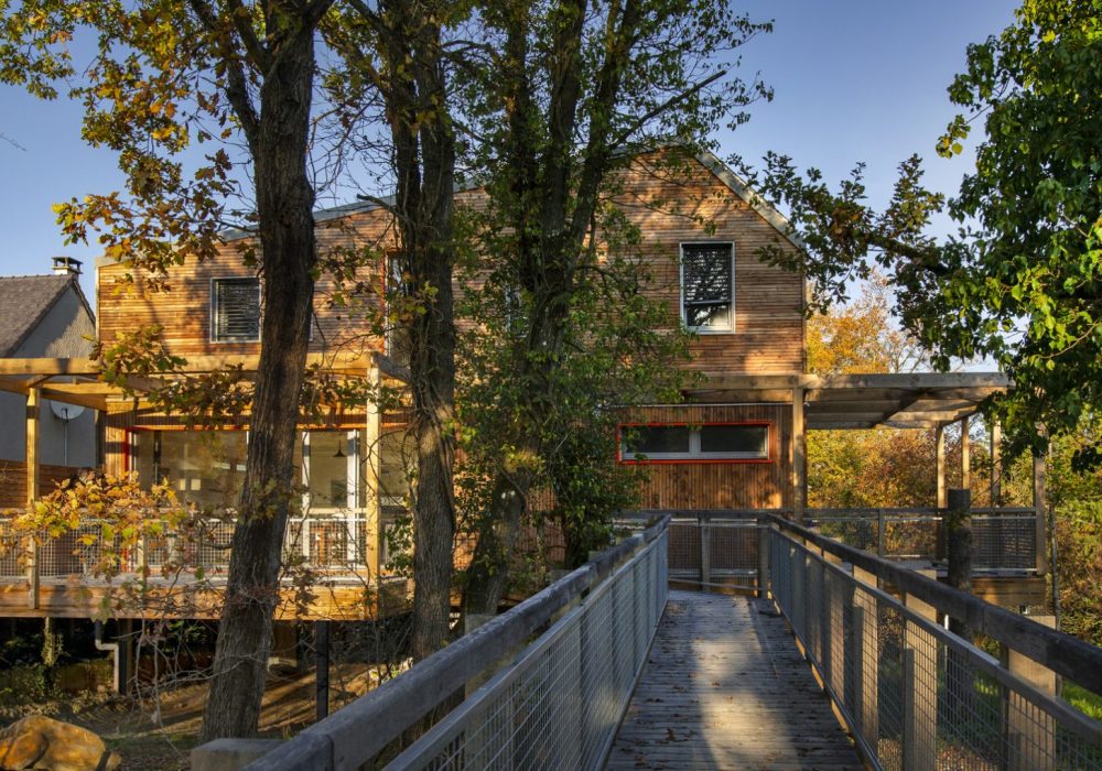 Son positionnement au fond du terrain mais en élévation, accessible aux PMR de la rue par une passerelle à moins de 5%, permet de positionner le séjour en élévation du terrain. Deux grandes terrasses sur pilotis viennent créer un effet de « cabane », afin d’offrir aux visiteurs une immersion dans la forêt de Fontainebleau. Les terrasses sont couvertes d’une végétalisation grimpantes soutenue par des câbles, et caduques pour apporter de l’ombre l’été et laisser passer la lumière l’hiver. Ces dispositifs plongent le bâtiment peu visible au cœur de la parcelle boisée.