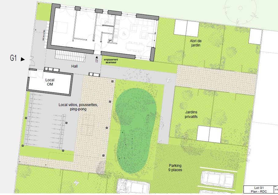Nous avons choisi de réduire l’impact de l’opération au sol au minimum, en plaçant la moitié du bâti sur pilotis, rendant les halls traversants, offrant au locaux communs en rez-de-chaussée visibilité et fluidité, permettant une transition en douceur et bienveillante du public au privé, de la rue à la cour et au jardin, tout en créant un espace de porche fonctionnel et habitable, de distribution mais aussi d’échange convivial.