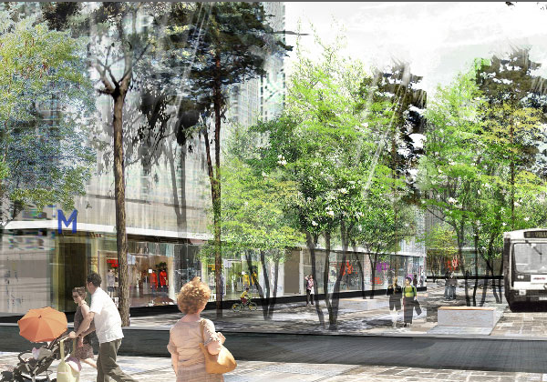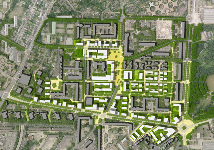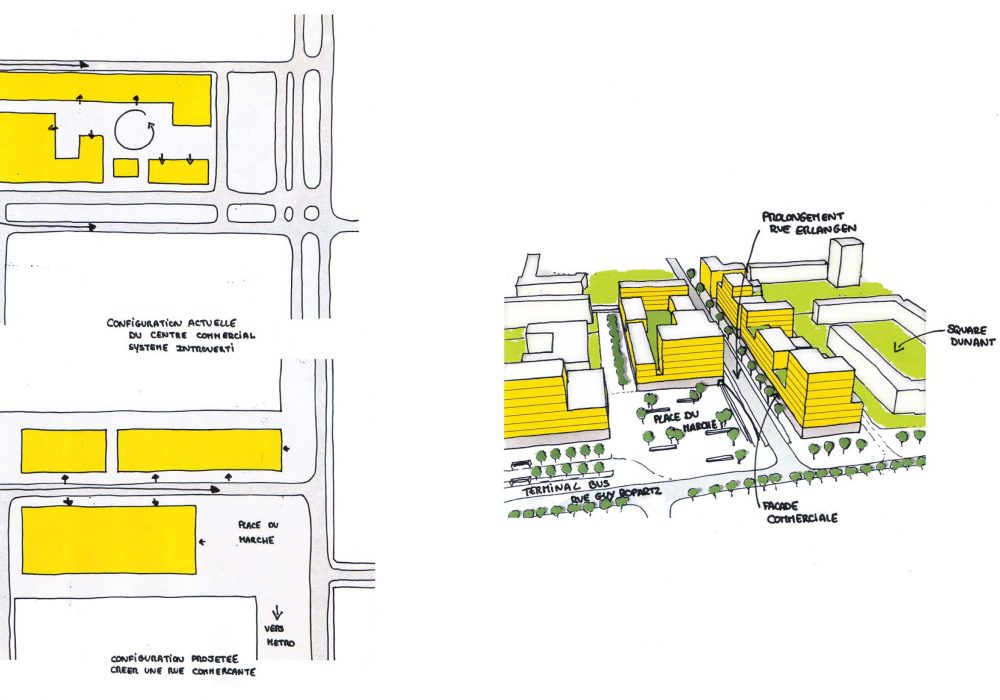 Le projet vise à faciliter les repères et les parcours quotidiens, à recréer des espaces dont les habitants puissent être fiers et dont les visiteurs pourraient se souvenir, et à supprimer les vastes étendues d’enrobé. Par analogie à l’idée de ville-parc dont le grand ensemble est le lointain ancêtre, le territoire est maillé par une série de «clairières» (les nouvelles places), par des «perspectives» (les nouvelles avenues plantées), et des «sentiers» (cheminements piétons et vélos). A l’inverse des espaces verts indifférenciés actuels, qui peinent toujours à trouver la bonne distance entre le collectif et le particulier, un réseau vert hiérarchisé est proposé, assumant la complexité de la ville et son rôle de mise à la bonne distance du privé et du public. A la matrice verte indéfinie, il est préféré des limites tangibles, des usages précis et diversifiés. La requalification des espaces publics s’accompagne de la construction de nouveaux programmes : logements collectifs, intermédiaires et individuels, locaux d’activités, commerces, bureaux, et équipements culturels. Des rapports étroits sont recherchés entre les édifices et les espaces publics qu’ils côtoient. Ce remaniement urbain associé à l’offre de transport donne au quartier une nouvelle intensité.