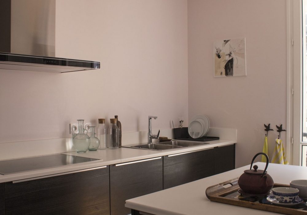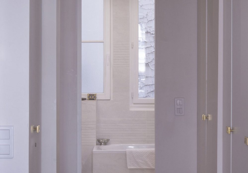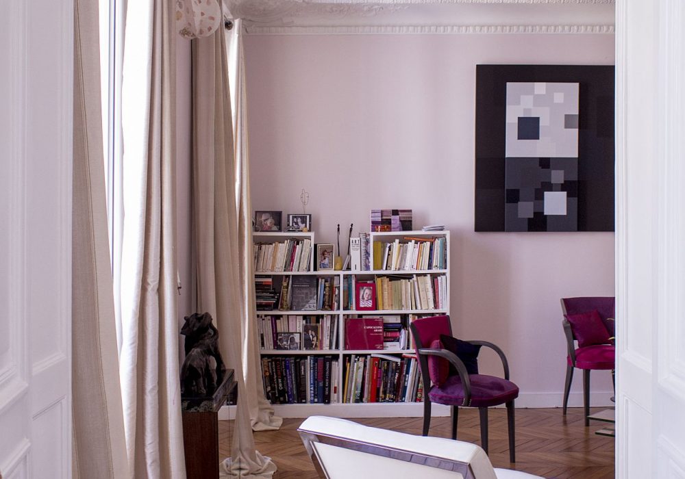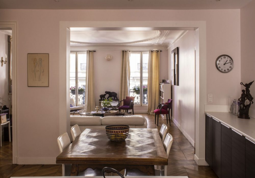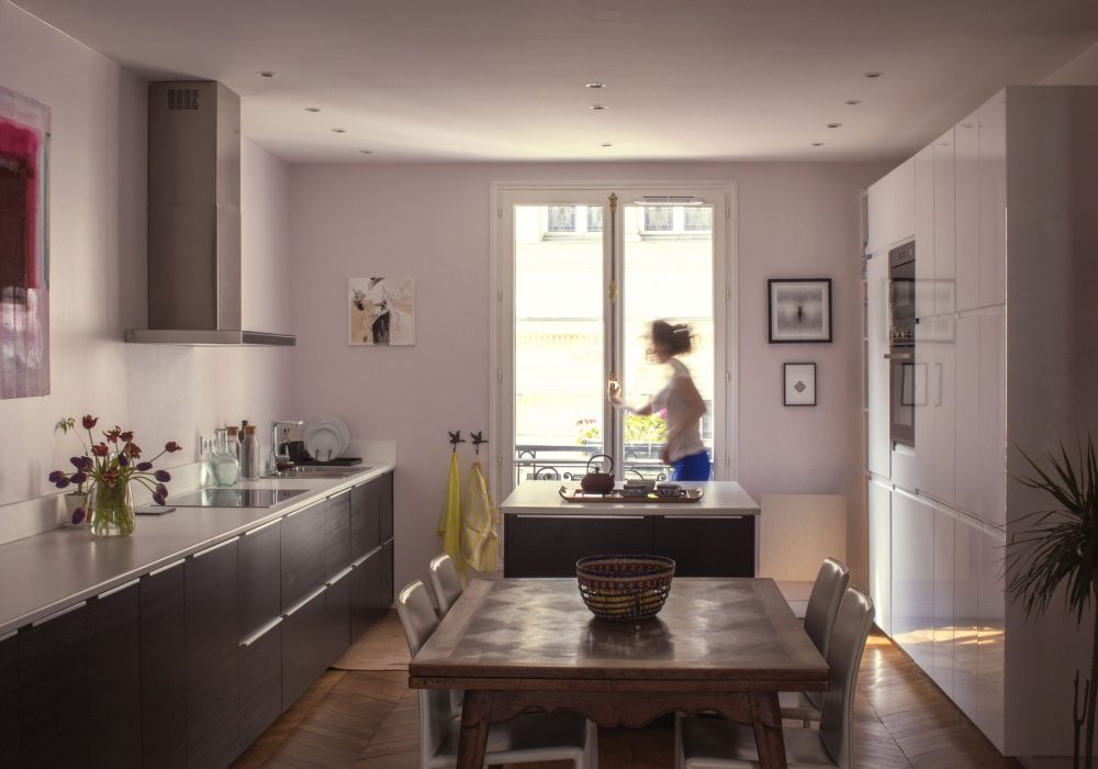 Bel appartement de 130m² à Paris, le projet consiste à rénover entièrement les sols, plafonds et murs, et moderniser la distribution, avec notamment l’ouverture d’un porteur entre la nouvelle cuisine et la séjour. La décoration moderne respecte le caractère patrimonial de l’appartement tout en allégeant certaines moulures, en unifiant les couleurs et en fluidifiant les circulations.