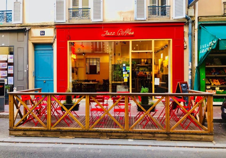 La nouvelle vitrine sera de couleur rouge sombre avec une enseigne lumineuse type tube fluorescent rouge avec le nom du restaurant: Jazz Coffee.
